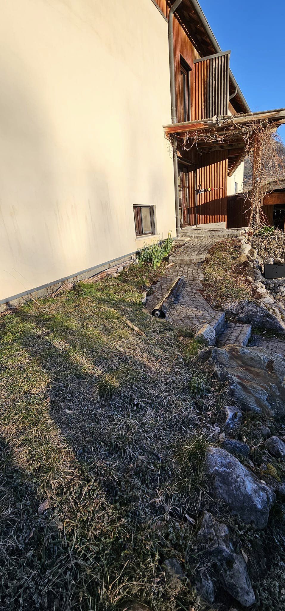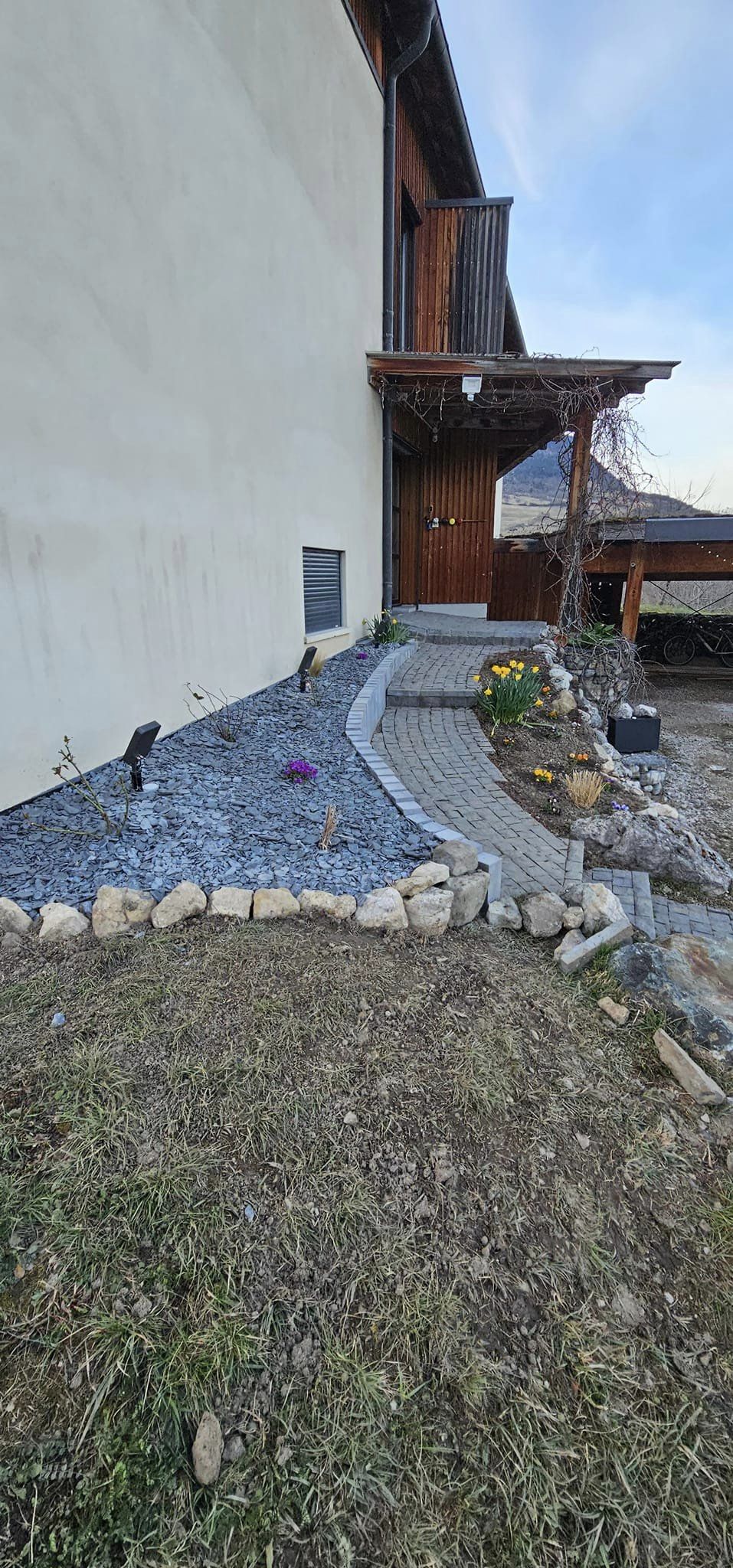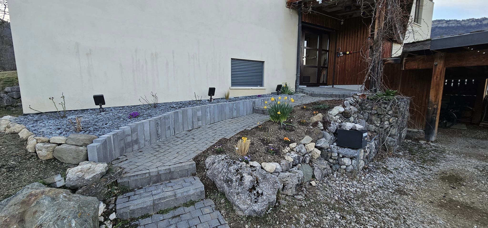 Réalisation d’un massif fleuri avec pose de bordure et paillage minéral devant une entrée de maison, avec la mise en place d’un éclairage en partenariat avec l’entreprise SURRElectricité
